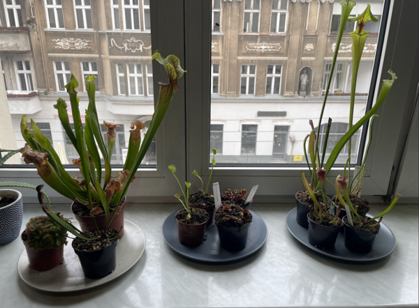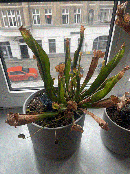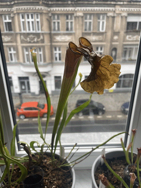 Witam grupowiczów, Proszę spojrzeć na moje roślinki - wyglądają jakby przeszły wojnę a mega o nie dbam i nie wiem co źle robię. Robią się suche od góry, muchołówki usychają itd. Roślinki zostały przesadzone w specjalnej dedykowanej pod te rośliny ziemi kupionej na allegro (osobna ziemia pod rosiczki i osobna pod resztę) do doniczek wraz z system wykonanym na podstawie poprzednich wpisów na tym forum (doniczka z dziurami która pozwala na to żeby cała ziemia czerpała wodę od spodu) Podlewam je filtrowaną wodą, która doprowadzam do wrzenia w czajniku, studzę i podlewam dopiero na następny dzień. Wszystkie kwiatki stoją na parapecie u mnie w kuchni / nie ma tam nie wiadomo jakich temperatur czy innych czynników zewnętrznych które mógłby by wpływać na ich zdrowie. Może za rzadko je podlewam? Może nie taką wodą? Pomóżcie proszę bo mnie przy śniadaniu moje kwiatki irytują zamiast cieszyć.....