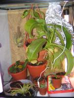 No zależy gdzie w planach mam różne rośliny... Na helkę i pływacze wypuściłem wilgoć z foggera ale nie tyle by niszczyła mi pędy kwiatowe... U góry wilgoć jest mniejsza dlatego wisi tam veitichii x maximus najniżej postawiłem rajah by się też trochę pokąpał :-) Świetlówka z tyłu to Fluora Glo z przodu Aqua- glo . Tylnia przypalała mi dzbanek więc go obróciłem i lekko przysłoniłem ... 2x15 W w T8 okazyjnie halogen 50 W.. głownie po to by dawał chłodnej parze siłę lecieć w górę i cyrkulować Chciałem kupić reflektory na świetlówki ale nie ma w magazynie .... Zdjęcie pokazujące lokacje terrarium jest wcześniejsze bo nie mam baterii do aparatu jeszcze u góry jest siatka :-) Martwi mi mnie tylko ta oplątwa z przodu jakby nawet w 2-3 dni lekko urosła ...oby przestała :-) A warunki hmm pracuje nad stabilizacją... Ale więcej >50-60 % a gdzieniegdzie po 100% np. u helki jest 23,2 stopnia w tej chwili. ( jak zacznie być koło 25 znów zacznę kombinować bo tyle nie może mieć)