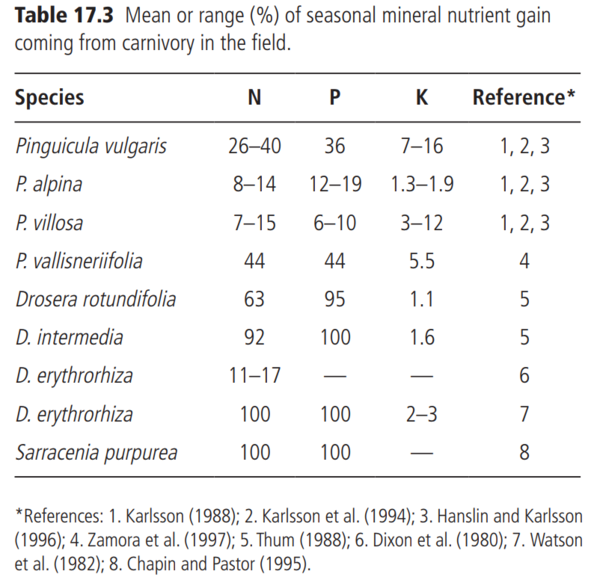 Dzięki za dorzucenie swoich pomiarów. Czym mierzyłeś te parametry? Jakie są najmniejsze wartości które mogłeś zmierzyć tam gdzie jest 0? Przy okazji poprzednich pomiarów sprawdziłem jak zmienia się EC torfu zalanego wodą. Torf zalałem wodą do konsystencji luźnego błota i co jakiś czas mierzyłem w tym EC żeby zobaczyć jak się zmienia. Początkowo EC szybko rosło, a potem się mniej więcej ustabilizowało. pH na początku i na końcu było takie samo, 3,75. Po około 13 dniach zebrałem wodę którą zalałem powyższy torf, potem torf przepłukałem kilka razy wodą destylowaną. Zostawiłem wilgotny torf na noc, rano dolałem trochę wody destylowanej i to co przeleciało przez torf zebrałem. Zmierzyłem w obu próbach wody zawartość Fe, Mg i K (pomiar techniką atomowej spektrometrii absorpcyjnej). Wyniki: Wcześniej pisałem o tym że roślinie trudno zaspokoić zapotrzebowanie na potas przez łapanie owadów. Znalazłem ciekawą tabelkę pokazującą ile pierwiastków rośliny w naturze mogą pozyskać z owadów. Wychodzi na to że potasu ledwo co pozyskują z owadożerności: Tabela pochodzi z książki: Ellison, A., & Adamec, L. (Eds.). (2017). Carnivorous plants: physiology, ecology, and evolution. Oxford University Press.