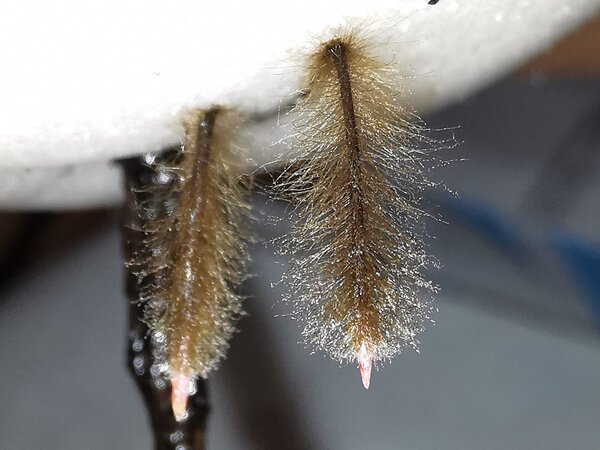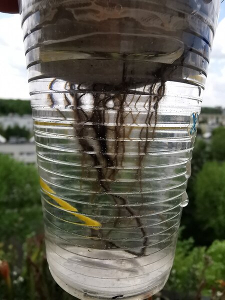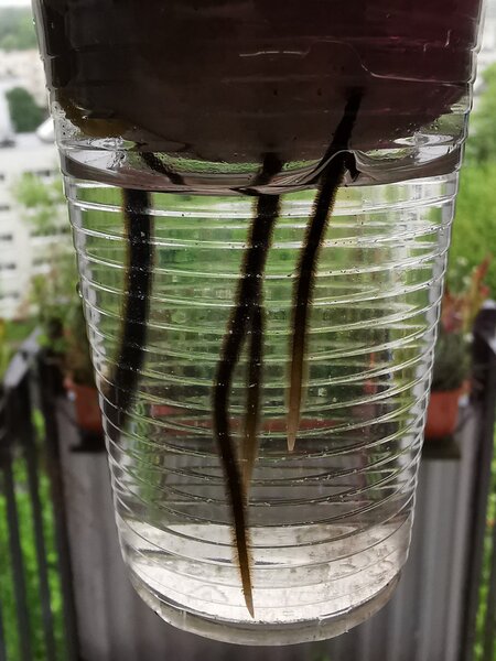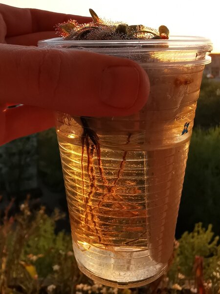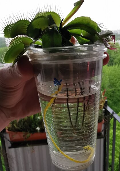 Jakiś czas temu pisałem że testuję uprawę roślin w prostej hydroponice. Po licznych zmianach i ulepszeniach chyba doszedłem do takiej konstrukcji kubeczków która mnie zadowala, a i rośliny wydają się być szczęśliwe Postanowiłem podzielić się z Wami jak to u mnie wygląda, może dla kogoś będzie to inspiracja albo ciekawostka. Tytułem wstępu, miałem problem z nicieniami w podłożu i postawiłem że muszę zastosować taki system uprawy, żeby każda z roślin rosła osobno, żeby nicienie nie miały jak się rozprzestrzeniać między doniczkami. Wymyśliłem też, żeby spróbować uprawy w podłożu całkowicie nieorganicznym, z założeniem że nicienie takiego nie lubią. Aktualnie prawie wszystkie moje rośliny trzymam w takiej konstrukcji, łącznie z tłustoszami meksykańskimi: Na górze jest czysty piasek. Pod nim jest materiał, który nie przepuszcza piasku, ale przez który łatwo przerastają korzenie. Jest też sznurek lub rurka z piaskiem, które przewodzą wodę do góry i powodują że piasek jest cały czas mokry. Z boku kubeczka jest otwór, przez który wylewa się nadmiar wody. Podlewam od góry. Tu przykład jak rośliny w tym rosną. Na górze niepozorna D. nidiformis: A korzeni ma tyle: Korzenie D. slackii: D. aliciae Fajnie wyglądają młode korzenie muchołówek, które jeszcze nie miały kontaktu z wodą. Po zmoczeniu włośniki się sklejają i nie są już takie włochate. Dla mnie taka konstrukcja ma zalety: -każda roślina rośnie osobno, nie ma możliwości żeby nicienie albo szkodliwe bakterie przenosiły się między rosiczkami -rośliny wydają się być zadowolone - podobają mi się korzenie które rosną w wodzie -w piasku nie rosną mchy, nie robi się zielony - nie muszę wykorzystywać torfu, który jest zasobem nieodnawialnym w perspektywie życia człowieka, a jego pozyskanie to zbrodnia na przyrodzie - nie zaobserwowałem żeby korzenie rosnące w wodzie gniły. Wbrew pozorom uważam że mają więcej tlenu niż korzenie rosnące w torfie. Wady: - każdą roślinę muszę podlewać oddzielnie. Podlanie "do pełna" wystarcza od około 6 dni w przypadku dużych rosiczek typu D. andromeda do ponad 2 tygodni w przypadku mniejszych roślin. - piasek jest sterylny więc trzeba dobrze dokarmiać rośliny. Przez moment niektóre rośliny wykazywały objawy niedoboru potasu ale dodałem potasu do wody i problem się skończył -rośliny rosną wolniej niż w torfie - dla mnie to nie jest duża wada bo mam mało miejsca i wolę rośliny o mniejszych rozmiarach - przygotowanie doniczek jest pracochłonne i nie są one zbyt piękne.