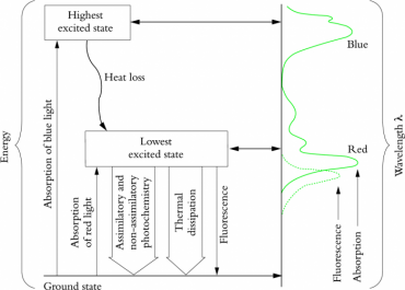 To nie takie proste. Owszem przy wysokim natężeniu światła roślina będzie chroniła się przed nadmiarem energii, ale ja nie o tym mechanizmie piszę. Niebieskie światło ma większą energię i powoduje przejście chlorofilu na wyższy stan wzbudzenia. Z tego stanu energia nie może być przekazana dalej, musi zostać częściowo zamieniona w ciepło, aż chlorofil osiągnie niższy stan wzbudzenia, taki sam jak podczas absorpcji światła czerwonego, o niższej energii. Dopiero z tego stanu wzbudzenia energia może być przekazana dalej. Tu cytat z wikipedii: Cząsteczka tego barwnika (chlorofilu) może absorbować zarówno kwant światła czerwonego (λmaks = 634 nm), przechodząc ze stanu podstawowego (trypletowego) do pierwszego stanu wzbudzonego (pierwszego stanu singletowego), jak i kwant światła niebieskiego, przechodząc ze stanu podstawowego do drugiego stanu wzbudzonego (drugiego stanu singletowego). Drugi stan wzbudzenia jest wyjątkowo nietrwały, cząsteczka chlorofilu szybko przechodzi do pierwszego stanu wzbudzenia, rozpraszając różnicę energii między stanami. Na potwierdzenie ilustracja graficzna: Tak więc roślina absorbując niebieskie światło ma z niego tyle samo "użytecznej" energii co z czerwonego.