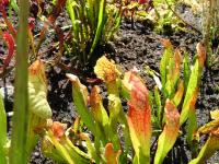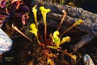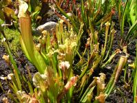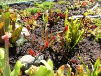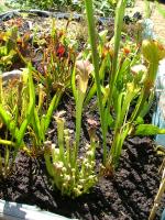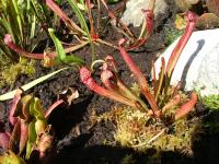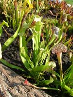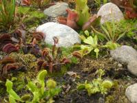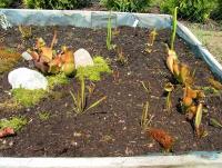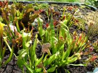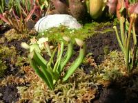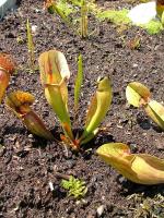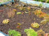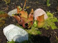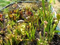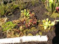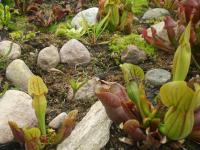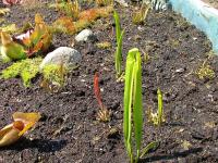 31 MAJA 2009 ROKU - ROSLINY ZACZYNAJA SIE WYBUDZAC W tym roku torfowisko jeszcze bez zadnych dekoracji, male kikuciki roslin dopiero zaczynaja wychylac glowy z torfu i jest pewne wrazenie pustki, ktore za kilkanascie dni zniknie oprocz tego jeszcze brzegi w tym roku tez nie zakryte. Nie kladlem dekoracji, ani nie zakrywalem jeszcze brzegow, poniewaz w zeszlym roku rozsial sie filiformis i rotundifolia i nie chce zadusic ich, a znajduje je gdzieniegdzie. Oto zdjecia: Ogolny rzut z gory, widac sporo pozornie pustego miejsca, gdzie zaczynaja kielkowac owadozerne, obszar w lewym gornym rogu to podloze dla kapturnic; torf, mech, piasek i czesciowo te kamyczki wymieszane. W prawym gornym rogu jest grunt dla mucholowek; torf+zwirek - miedzy dwoma kamieniami a 2 purpurowymi. Srodek i dolna czesc, to glownia rosiczki, przeplatane z kapturnicami o mniejszych rozmiarach Na zdjeciu 8 filiformisow. W ogole jest ich tam 16 doroslych z czego 4 maja pedy kwiatowe. Na pierwszym planie Sarracenia flava var flava, lacznie sa 3 kepki z czego jedna dorasta do 50 cm. Zoom na intermedie. Ogolnie znajduje sie ich ponad 10. a taka dziurka w konarze z dwoma filiformis lewa strona. te dwie mucholowki gianty nie zimowaly tam, za to red dragon po lewej budzacy sie owszem tak. Te dwie najwyzsze kapturnice tutaj to dwie oreophille, rozmiar ich lisci dochodzi mi do ponad 50 cm. Miedzy nimi po prawej flava var flava a z lewej S. ladies in waiting papuzia, juz 3 rok tutaj wegetuje pomiedzy purporowymi pole wschodzacych mucholowek co nie bardzo widac na zdjeciu... a ta folie z tylu zaslonia kapturnice bialolistne i mieszanki z nimi, gdy tylko podrosna troche. Swoja droga bialolistne i ich mieszanki budza sie najpozniej i najwolniej :/ Wielka kapturnica purpurowa - zima nawet nie uszkodzila milimatra lisci starych. Dodatkowo juz ma 2 wielkie nowe liscie i 2 rosna. Uwielbiam to bydle to inna odmiana purpurowej niz wyzej, zdaje sie ze venosa. na tyle trzecie flava var flava, widac tez kilka okraglolistnych , lacznie jest ich 6. po lewej capensis probuje sie utrzymac przy zyciu i dobrze mu to wychodzi. Widzicie tez kolejna kapturnice purporowa, w sumie roznych czystych odmian purpurowej jest tam 5.