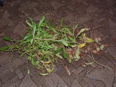Kilkumetrowe ventraciszcze dzisiaj poleciało do ścinki. Przy tej wielkości drewna było już więcej niż zielonego, dzbanki coraz mniejsze, nawet młode pędy potrafiły zamrzeć. W doniczce zostały 3 pędy po 30 cm, 2 po 70 cm i 8 stożków do ukorzenienia, w tym 1 kwitnący I w pokoju zrobiło się jaśniej. A to efekty cięcia: -