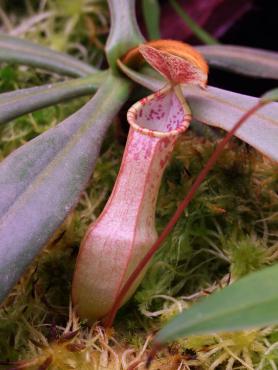 Moja N. eustachya wygląda tak: Dość podobna, choć dzbanki nie są tak "campanulowate" jak u Ciebie, biodro jest też wyraźniej zaznaczone, ale to na pewno jest związane z różnicą w wieku roślin. Natomiast także nie ma skrzydełek na dolnych dzbankach (co jest charakterystyczne dla tego gatunku), łodyga i wąs łatwo się wybarwia na czerwono, a wąs podobnie jak u Ciebie zaczyna się minimalnie przed wierzchołkiem liścia. Moja roślina pochodzi od Wistuby.