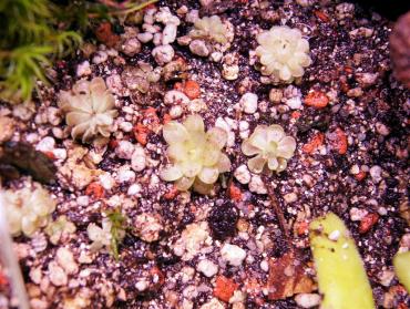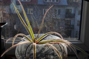 Poglądowe zdjęcia po zimie - czyli odpowiedź na pytanie czy można przezimować D. regia i DL na parapecie pod którym działa kaloryfer. Można. 1 z 2 rosolistników przeżył z dobrym stanie, drugi ledwo żyje, choć winę zwaliłbym tu na źle dobrane przeze mnie podłoże przed zimą, zbyt luźne, nie trzymające wody, przy kaloryferze i zimowym doświetlaniu ususzyło to roślinę. D. regia przeżyła w dobrym stanie, a to pewnie też dlatego, że rośnie w kuli. Roridula straciła 2 z 3 miejsc wzrostu - powód? Również przesuszenie.