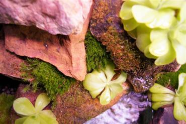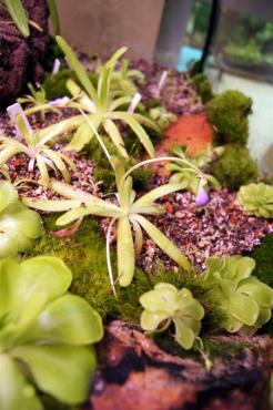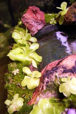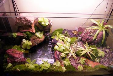 OK, w ostatni weekend udało mi się nieco przearanżować zbiornik. Niestety nie ma już w nim D. scorpioides - roślinki padły. Reszta, mimo przesadzeniowych turbulencji, powinna przetrwać. Może wydać się trochę pustawo, bo sporo samomnożących się okazów sprzedałem, ale jesienią, jak wszystko się "uleży" i rozkwitnie, powinno wyglądać lepiej. Rzut ogólny: P. "Tina": Skałka z P. moctezumeae i P. gigantea alba x moctezumeae musiała się ostać: Maluchy (Pinguicula 'Florian', spec. 'El Mirador', laueana, esseriana) Wodospad znów działa: Stwierdzam, że bardzo dobrym pomysłem, jest ustawienie wszystkich roślin w szerokich i płaskich plastikowych pojemnikach (takich jak po pomidorach koktajlowych). Jak trzeba coś przesadzić to tylko wymienia się podłoże i tyle, a cały dół terra z keramzytem pozostanie "czysty", bez resztek zużytego podłoża. Skróciło to znacznie proces czyszczenia terra i pozbywania się starego podłoża. Wróciłem też to mchu - poduszek. Od kiedy PG wylądowało w salonie przy wyższych temperaturach mech torfowiec przestał się sprawdzać. Zobaczymy jak poradzą sobie poduchy. A niedługo do zbiornika z wodą wróci Darlingtonia. Muszę jej tylko stworzyć wyspę
