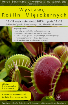 Chcąc trochę ożywić zimowy letarg pragnę uprzejmie poinformować, że: Tradycyjna Wystawa Roślin Mięsożernych w Ogrodzie Botanicznym UW w Warszawie (Aleje Ujazdowskie 4), przywołująca w myślach wielu, mam nadzieję, bardzo przyjemne wspomnienia odbędzie się w 2015 r. w dniach 16-17 maja. Proszę wpisać tę datę w wasze ociekające nowością kalendarze 2015:) Formuła nieco się zmieni, ale powinniście być zadowoleni:) O szczegółach już niebawem!