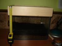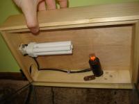 Co ja się tu będę w oprawki bawił ^^ Tak wygląda wewnętrzna część pokrywy: Świetlówka kompaktowa niezintegrowana 6400K barwa 865 która będzie włączana na dzień (miło aby ktoś podał ile czasu dziennie powinna się świecić) i obok niej mała diodka (dla ozdoby) będzie świecić 24\24. 4 dziurki do wentylacji. Wiatraczek pc zamontowany na zewnątrz, wdmu[beeep]ący powietrze, połączony z wyłącznikiem czasowym włączającym go co 15 min na 15 min. Statecznik zabudowany w jakiejś obudowie od starej lampki. A oto całość: Martwią mnie te wykwity... Od czego to? Torf czysty, podlewane tylko destylką... Z przodu będą rosły torfowce, a z tyłu a tej "górce" pływacze. Tylko jeden gatunek pływacza będzie rósł na torfowcu - już nie pamiętam jak się nazywał, ale emalino mówił, że tak lubi. ^^ COMMENT PLEASE i mówić, co jest źle.
