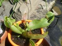 Wczesną wiosną wystawiłem moją kapturnicę na dwór, stoi na nim do teraz dzień i noc, w pogodę i niepogodę, cały czas w tym samym miejscu. Przeżyła już mrozy poniżej -5 stopni i upały powyżej 30 stopni, burze i gradobicia po których zostało z niej same kłącze. Od pewnego czasu pogoda, temperatura się ustabilizowała. Inne rośliny które cały czas towarzyszyły jej we wszystkich przygodach (d. aliciae, d. muscipula, d capensis i d. capensis alba) pięknie rosną i się pięknie wybarwiają. Jednak kapturnica jakoś dziwnie baaaaardzo wolno rośnie, kaptury są niewybarwione (stoi w pełnym słońcu) i wyrastają jakieś takie zniekształcone. Czy to może być zbyt duża ilość światła, czy co? Nie mam pojęcia... Inne rośliny rosną normalnie. Oto i ona: Oto miejsce w którym stoi: Jedyny wariant nad jakim myślałem to zbyt mocne światło (z alicją miałem to samo zamontowałem jej taką krateczkę rozpraszającą światło, którą widać na ostatnim zdjęciu i pomogło) czy to może być od tego? P.S. - Od kąd wystawiłem moje rośliny na pełne słońce to alicja okazała się all red a muchołówka red green ^^