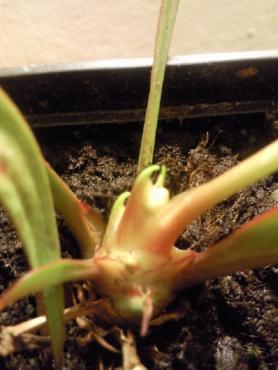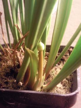 13. Witam! Mamy początek stycznia a moim dwóm Sarraceniom nie chce się już spać : S. leucophylla S. "Ladies in Waiting"- dopiero co wyłaniający się kwiat Przyznam się, że trochę mnie to dziwi. OK, temperatury nie oscylują już w granicach -15*C, ale nadal jest zimno. Poza tym nie zauważyłem, aby ostatnio zwiększyła się ilość słońca, co wg mnie ma kluczowe znaczenie dla powstawania kwiatów u kapturnic ( zaznaczam, że piwnica, w której zimuje kapturki ma okno ).