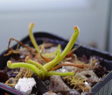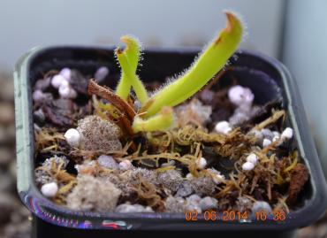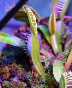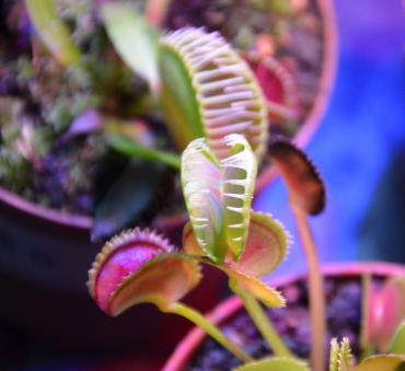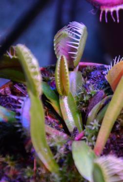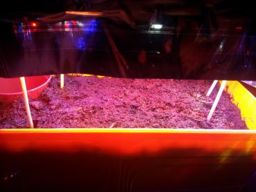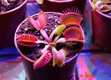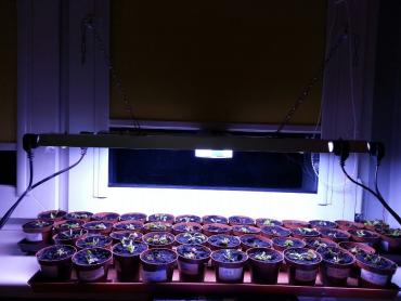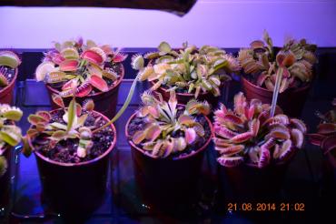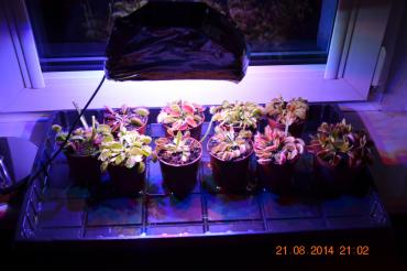 Na koniec zdjęcie jak to świeci. Doniczka z wysianymi nasionami muchołówek. Uprzedzam, że to całkowity prototyp, zwłaszcza oparcie "lampki" na wykałaczkach  porządną będę robił za miesiąc.