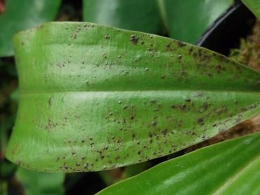 Witam. Mam problem z moją bicalcaratą. Liść z góry: Liść od spodu: Co zaatakowało tego dzbanecznika? Dodam, że te plamki obecne są też na wąsach i dzbankach.