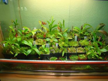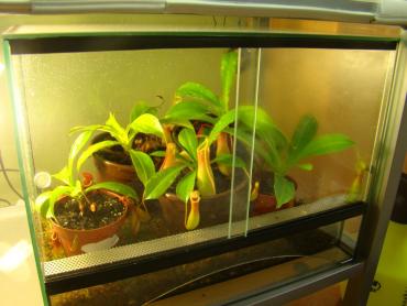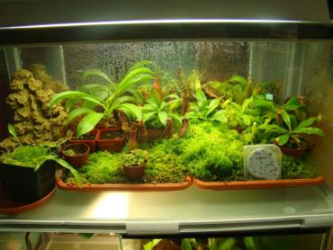 11. Minął już miesiąc, i muszę powiedzieć, że urządzenie terrarium się opłaciło . Jedyne usterki musiały oczywiście wydarzyć się podczas mojej nieobecności, są to: - awaria wentylacji, przez co w terrarium rośliny kisiły się w niemal 30 stopniach 24h/ dobę przez ponad tydzień - niestety nie przetrwała tego moja ulubiona H. sarracenioides . - przy przesuwaniu stołu przed wyjazdem poluzował się kabelek w stateczniku, przez co oświetlenie nie działało przez nieco ponad tydzień - jedyna zmiana to gorzej wybarwione, świeże pułapki u niektórych gatunków. Teraz wszystko naprawione, wentylacja daje przepływ powietrza, a dzięki naszej szarej pogodzie noce robią się coraz chłodniejsze . Poza tym wszystko OK, rośliny zdają się nie narzekać