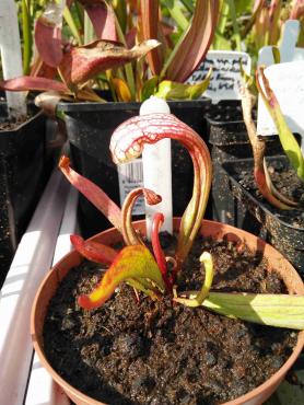 Mała aktualizacja S. x 'Sky Watcher' w zeszłym roku otrzymałem ją w identycznym rozmiarze - wzrost musiało zatrzymać kilkudniowe przegrzanie w szklarni na początku tegorocznego sezonu, ale zdaje się, że zaczyna już rosnąć prawidłowo. S. purpurea ssp. venosa 'Lipless'/ 'Evelina' roślina dorwana na dniach w OBI - charakterystyczną deformację wargi jedni lubią inni nie. Ja się przekonałem i kupiłem jako ciekawostkę do swojej kolekcji. Poza deformacją wargi roślina ma dosyć intensywne owłosienie na całej zewnętrznej części dzbanków (na zdjęciu widoczne raczej w powiększeniu).