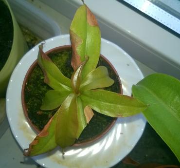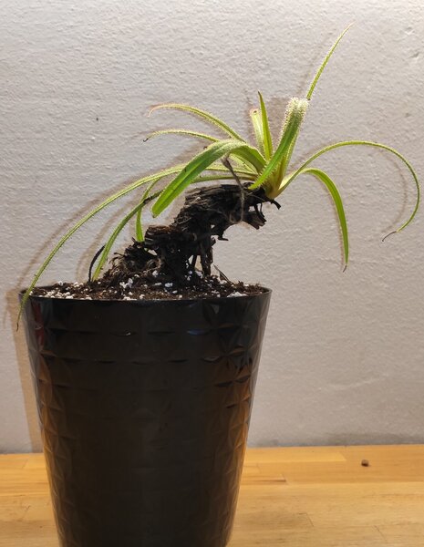 Posiadam kilkuletnią drosera regia ( 5 lat). Z biegiem czasu przyjęła dość specyficzny pokrój widoczny na zdjęciu. Jej rozeta uciekła już praktycznie ponad krawędź doniczki. Po prawej stronie widoczne korzenie przybyszowe, które wypuściła z głównego pędu. Czy waszym zdaniem można ją zakopać w większej doniczce, do poziomu rozety, ? Czy lepiej nie ruszać i pogodzić się z taką naturą ? Zaletą obecnej sytuacji jest to, że roślinie nie grozi zbyt duża wilgotność w okolicach stożka wzrostu, czego ponoć nie lubi. Ale wolałbym, żeby przyjęła normalny pokrój, oczywiście tylko w wypadku jeśli jej to nie zaszkodzi Czy przyczyną takiego pokroju mogą być nieprawidłowe parametry hodowli( np. niedostateczna ilość światła)? Dodam, że w sezonie liście są o wiele dłuższe i roślina wygląda zdrowo, rosy sporo, gruczoły się ładnie przebarwiają, mnóstwo robali łapie.