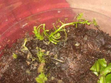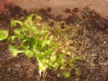 Kolejny problem mam z czernieniem i obumieraniem niektórych rosiczek. Jest też trochę pleśni w torfie. Spróbowałem zastosować rozcieńczony sok z czosnku, na pleśń chyba nawet trochę działa. Jednak najbardziej mnie martwi to czernienie, nie chcę, aby przeszło na sąsiednie, rozwijające się roślinki.