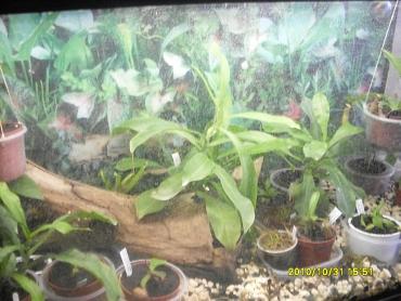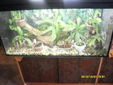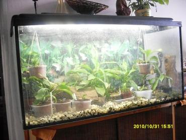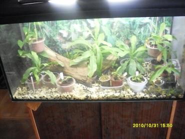 dzbanki posadzone sa w torfie wymieszanym z perlitem ,doniczki stoja w wysokich podstawkach ,na dnie mam zwir ktory zalany jst woda ktora skrapla sie ,bo mam doprowadzona rure z nawilzacza powietrza wiec robi sie mgielka ktora sie sprapla,nie mam wiatraczka akwarium ma plastikowa gore taka jak w akwariach dla rybek