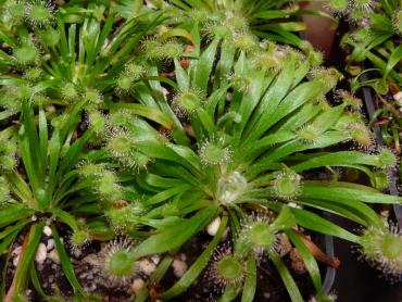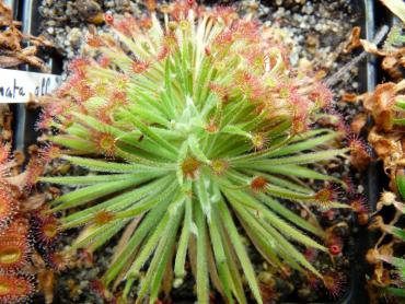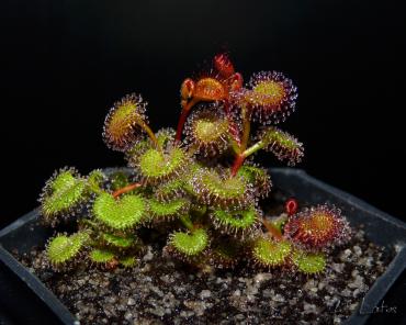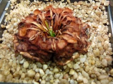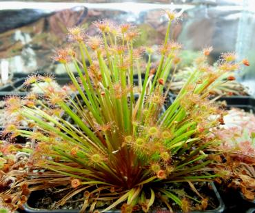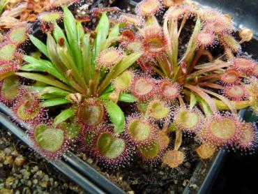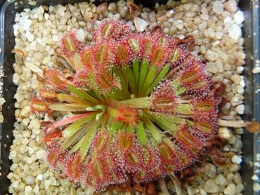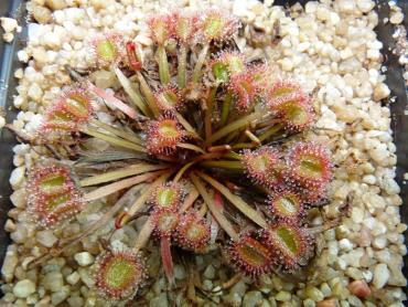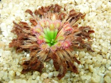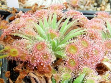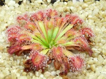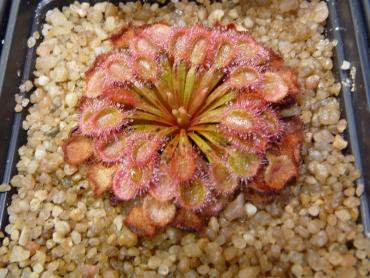 Rosiczki grupy Petiolaris Complex, sekcja Lasiocephala Rośliny z tej grupy są jednymi z ciekawszych rosiczek głównie ze względu na swój niepowtarzalny wygląd i fantastyczne ubarwienie. Większość tworzy przyziemne rozety, dochodzące do kilkunastu, a nawet kilkudziesięciu centymetrów średnicy. Zaliczamy do nich: D. brevicornis, D. broomensis, D. caduca, D. darwinensis, D. derbyensis, D. dilatato-petiolaris, D. falconeri, D. fulva, D. kenneallyi, D. lanata, D. ordensis, D. paradoxa, D. petiolaris, oraz Drosera Banksii- choć jest to jeszcze sprawa sporna, czy na pewno można ją zaliczyć do grupy Petiolaris. W hodowlach spotkać można również wiele roślin spokrewnionych z danym gatunkiem opisanym skrótem 'aff.'; np. Drosera aff. petiolaris. Drosera aff. petiolaris Ponieważ poszczególne gatunki tej grupy bardzo łatwo krzyżują się między sobą można spotkać również wiele ciekawych hodowlanych hybryd tych roślin. Rosiczki Petiolaris Complex są specyficzną grupą roślin, głównie z powodu warunków panujących w ich naturalnym środowisku. Głównie są to intensywne oświetlenie, wysoka temperatura i podwyższona wilgotność otoczenia. Nie będę się rozdrabniał w opisy dla poszczególnych gatunków, ale postaram się przybliżyć ogólne zasady postępowania z tymi roślinami. Najłatwiejszą w uprawie jest z pewnością Drosera paradoxa – nieźle radzi sobie nawet w warunkach „parapetowych”. Najtrudniejsze w utrzymaniu są D. caduca i D. falconeri. Pozostałe rosiczki tej grupy nożna traktować jako średnio trudne w hodowli. Krzyżówki wydają się wykazywać większą odporność niż czyste gatunki. OGÓLNIE Chcąc hodować te rośliny powinniśmy najlepiej zaopatrzyć się w terrarium z jakimś przyzwoitym oświetleniem i np. przewodem grzejnym, gdzie zapewnimy im trochę więcej ciepła i światła niż jest w naszym klimacie. Bardzo ważną rzeczą jest ruch powietrza w zbiorniku, szczególnie dotyczy to okresu spoczynku. Jeśli nie chcemy dorobić się jakiejś niechcianej pleśni, dobrze jest zamontować jakiś wentylatorek np. od komputera. Rośliny nieźle radzą sobie w terrarium dla dzbaneczników nizinnych, ale zalecał bym jednak przygotować dla nich osobny zbiornik. Opis budowy takiego terra znajduje się tutaj: http://www.rosliny-owadozerne.pl/index.php...iolaris+complex TEMPERATURA Rosiczki tej grupy lubią wysokie temperatury. Zalecał bym 20- 40ºC, a nawet 45ºC. Natomiast nie polecał bym spadków poniżej 15ºC ponieważ rośliny mogą to odebrać jako sygnał do wejścia w spoczynek. Dobrze jest zamontować na dnie terra przewód grzejny i ustawić termostat na 25ºC, wtedy mamy pewność że temperatura nie spadnie nam poniżej wybranego poziomu. OŚWIETLENIE Petiolaris są chyba najbardziej światłolubnymi roślinami ze wszystkich owadożerów. Optymalne warunki dla tych roślin mogą być zabójcze np. dla dzbanków czy innych rosiczek. Im więcej światła zapewnimy roślinom, tym one odwdzięczą się nam piękniejszym wybarwieniem. Dobrze jest także ustawić terrarium tak, by przez kilka godzin dziennie padały tam promienie słoneczne, najlepiej przed południem gdy słońce daje więcej światła, a mniej ciepła (w tym przypadku raczej nie grozi to ugotowaniem roślin) Dla terrarium o wymiarach30 x30 x 40 polecam oświetlenie 50- 60W w postaci świetlówek liniowych lub kompaktowych o barwie powyżej 6000K. Oczywiście dla większego zbiornika tym musimy dobrać proporcjonalnie większą moc. Oświetlenie umieszczamy możliwie blisko, 15- 25cm nad roślinami. Kilka egzemplarzy mam w terrarium z dzbankami nizinnymi, można powiedzieć że czują się tam całkiem nieźle, ale gdy dzbaneczniki są pięknie wybarwione, rosiczki są po prostu całe zielone- no może leciutko zaróżowione. Więc zalecam światło zdecydowanie silniejsze niż dla dzbanków. Drosera darviniensis x ordensis przy mocniejszym świetle i w terra dla dzbanków PODŁOŻE Najczęściej stosowaną mieszanką jest torf i piasek w stosunku 1:1, jednak rośliny dobrze rosną w innych podłożach np. torf + perlit- 1:1, torf+ perlit+ piasek- 2:1:1,martwy sphagnum + perlit+ piasek- 2:1:1. Osobiście stosując wymienione podłoża nie zaobserwowałem jakichś znacznych różnic w rozwoju roślin. Spotkałem się również ze stosowaniem mieszaki torf+ piasek+ glina. Rośliny bardzo dobrze rosły w takim podłożu, ale sam tego nie stosowałem więc trudno mi się wypowiadać. Ważną rzeczą jest również wysokość doniczek. Zalecał bym kilkanaście centymetrów wysokości, a i tak można się spodziewać że korzenie roślin zaczną wychodzić przez dolne otwory doniczki. Niektórzy hodowcy wypełniają dno terrarium kilkucentymetrową warstwą torfu, a dopiero na tym umieszczają doniczki z roślinami. PODLEWANIE W okresie wegetacji rośliny lubią mieć mokre podłoże, chociaż okresowo nieźle znoszą nawet lekko wilgotne, ale jak u większości rosiczek starajmy się aby miały wody pod dostatkiem czyli lejemy 2cm do podstawka, a gdy zostanie wchłonięta- uzupełniamy. inaczej wygląda sprawa gdy roślina wchodzi w stan spoczynku, ale to opiszę poniżej. OKRES SPOCZYNKU Życie roślin grupy Petiolaris można podzielić na dwa etapy: okres wegetacji oraz okres suchego spoczynku. Wbrew pozorom, w okresie wzrostu są to dość silne i odporne na błędy rosiczki, problemy występują najczęściej w okresie spoczynku. Wtedy to przez drobne zaniedbania można łatwo stracić roślinę. Potrafią one wejść w stan spoczynku w najmniej oczekiwanym momencie i nawet przy dobrych warunkach nie będziemy mieli na to wpływu. Cała filozofia polega na obserwacji długości liści wytwarzanych przez roślinę. Gdy roślina wchodzi w fazę spoczynku zaczyna wytwarzać coraz krótsze liście, a w momencie wybudzania liście są coraz dłuższe. Kiedy zauważymy tworzenie przez roślinę coraz krótszych liści ograniczamy podlewanie do chwili gdy po