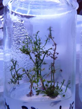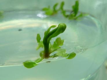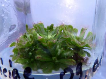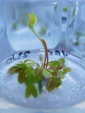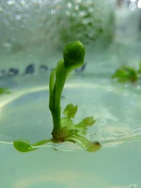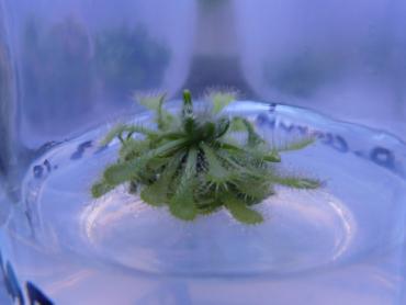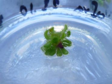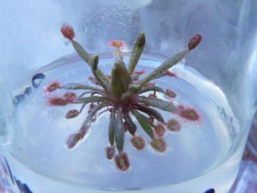 25. Witam' Dziś robiąc przegląd mojej sterylnej hodowli natknąłem się na ciekawe zjawisko. Muchołówka odmiany 'Vigorous' w dziwny sposób zaczęła rosnąć ku górze. Przypomina to trochę jak pęd kwiatowy, tylko że roślina ma 1cm średnicy i 25.07 była jeszcze nasionem, czyli żyje niecałe dwa mies. Odbywa się to bez ingerencji jakichkolwiek hormonów, na czystej 50% MS