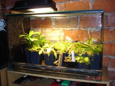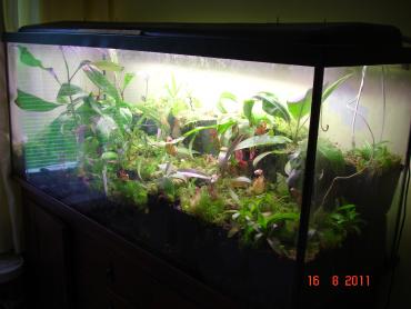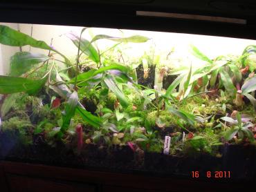 10. Ja akurat mam oświetlenie w terra nizinnym w środku zbiornika, są to świetlówki 2x54w T5 które grzeją się niesamowicie, dosłownie parzą przy dotknięciu, ale dzięki temu mam w środku temp. około 28-29C więc idealnie. gdyby były na zewnątrz było by w środku tylko 22C więc stanowczo za mało dla nizinnych dzbanków. Wymogiem jest tylko dosyć wysokie terra, bo przy wysokości 40cm świetlówki będą przypalać z czasem wyższe dzbanki.