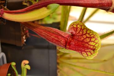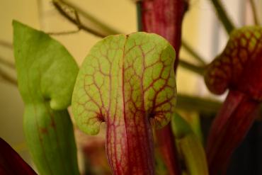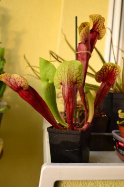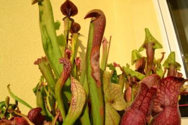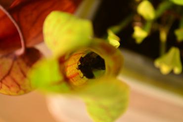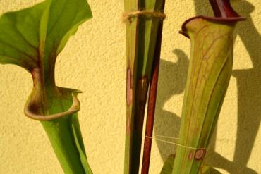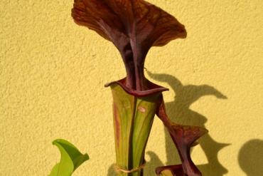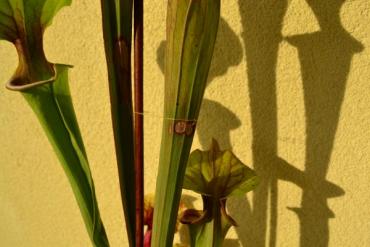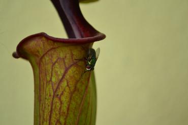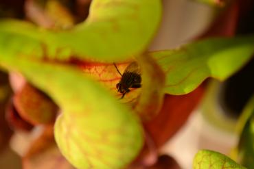 Dziękuję bardzo za błyskawiczne odpowiedzi Przyznaję, że w dzbankach znajdują się pokłady bliżej niezidentyfikowanych obiektów latających, jak np. w tym... Aromaty z nich się wydobywające są...hmmm...powalające i niezapomniane. W połączeniu z wonią samych kapturnic dają niezapomniane wrażenie. Zapewne to jeszcze bardziej przywabia muchy, ponieważ najczęściej widzę w ich pobliżu padlinówkę cesarską: i ścierwicę mięsówkę: Ich nazwy mówią same za siebie. No cóż, cieszę się, że nie są to błędy w uprawie, a moi drapieżni podopieczni są skuteczni w tym, do czego stworzył je dobór naturalny. Jednak to prawda, że irytujące jest wycinanie najładniejszych wiosennych liści. A taka dumna byłam z S. flava x oreophila, która na wiosnę wypuściła 0,5-metrowego liścia. Jak tak dalej pójdzie, to będę musiała jej usunąć dzbanki i zostaną same nieowadożerne liście.