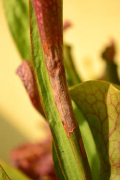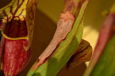 Nie no, nie będę wycinała każdego liścia, który ma malutką plamkę. Poczekam, aż roślina wycofa z liścia chlorofil i inne barwniki, a potem, słowami duetu Ani Mru Mru, ,,rachu ciachu i po strachu". Chociaż raczej wtedy ,,strachu", bo jeżeli na zewnątrz wydostanie się to, co siedzi w środku dzbanka... no cóż... Oby otwór był na tyle mały, by te podgniłe truchełka nie wypadły mi na ręce