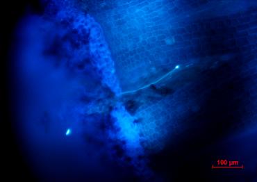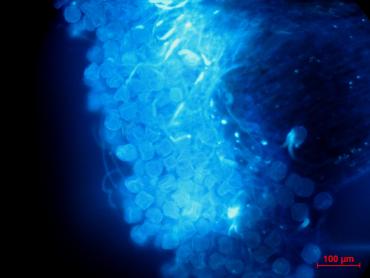 Fakt, ale takową sytuację podałem, żeby pokazać, że czasem się jednak da. Jeśli ktoś pójdzie na kierunek na studia, gdzie będzie to możliwe (u mnie to jest możliwe, bo koleżanka to robi u marchwi), to warto żeby wiedział o czymś takim, a nóż może podsunąłem komuś kierunek studiów. To co opisałeś to jedna z metod pozbywania się/redukcji niezgodności prezygotycznej. Pyłek napromieniowany (nieżywotny) tego samego gatunku umieszcza się na znamieniu słupka wraz z pyłkiem obcym i w ten sposób ułatwia to drogę pyłkowi obcemu by w ogóle wrósł w znamię. Jest kilka innych również metod pokonywania tej bariery prezygotycznej, choćby pozbywanie się znamienia i zapylenie słupka, gdy wciąż jest wilgotne po zranieniu. W skrajnych przypadkach nawet zapyla się na szalkach na agarze. Widziałem zdjęcia również lilii gdzie na szalkach umieszczono dwa słupki z różnych gatunków zapylono obydwa krzyżowo, i gdy łagiewki wrosły wystarczająco głęboko odcięto fragment słupka wraz z pyłkiem i przeniesiono wzajemnie w miejsce zranienia analogiczny fragment słupka z drugiego gatunku, a miejsce przecięcia i zespolenia komponentów zlepiono fragmentem agaru. Uzyskano mieszańce, to jest wstanie każdy zrobić mając prowizoryczne laboratorium, które widywałem już u was. Taka uwaga, upłodnić można nie tylko kolchicyną, łatwiej by było dokonać fuzji protoplastów obovaty, a nie sadzę by tego próbowali, bo nie słyszałem. O kolchicynie słyszałem w tym wypadku. Ale trzeba mieć do tego sprzęt, ale stosunkowo powinno wyjść to łatwiej. Na mojej uczelni da się to zrobić. Kto wie.. może znalazłem teraz temat doktoratu? Jeszcze jedna uwaga dokonując 8-10 zapyleń (tak jak to Ty zrobiłeś) nie sugerowałbym się taką ilością.... Na statystyce braliśmy że trzeba brać minimum 30 zapyleń, a optymalnie 50 by być pewnym. Ja zapyliłem ok 500 kwiatów borówki w tamtym roku, tylko jedna siewka (5 cm) jest ciekawa..... więc wiesz.... Realia są takie, że bawienie się w takie coś to trzeba mieć wytrwałość, nikt nie mówi, że jest łatwo, ale wole myśleć że coś jest możliwe, bo to mnie bardziej motywuje. Jeśli usłyszę że cos jest niemożliwe to mnie motywuje bardziej, ale przynajmniej musze miec jedną przesłankę lub myśl która mnie skłania że jednak się da. Zdjecia spod mikroskopu fluorescencyjnego Pomimo takiego zapylenia pyłkiem: (u wrzosowatych pyłek stanowi tetrada -> tak jakby 4 ziarna pyłku połączone ze sobą z czego każde może zapłodnić) tylko pojedyncze łagiewki wychodziły poza słupek (na zdjęciu brak zalążni)