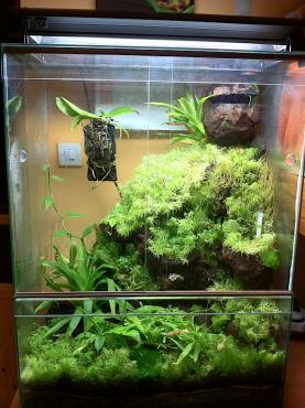 A jaki masz zbiornik na wodę z foggerem? Nie łatwiej i bardzej opłacalnie jest dać razem fogger i wiatraczek? Czy fogger nie jest troszkę za często? A ja też mam chrobotek tylko troszkę inaczej wygląda Spryskujesz ręcznie jeszcze terrarium? Uważaj na mech z lasu-pocuchy, nie nawadniaj ich specjalnie, bo zaczynają brązowieć, a tak jak są tylko wilgotne to ładnie rosną