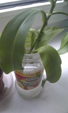 Podlewam od góry, nie ma podstawki. Woda w słoiku to odstana woda z filtra brity.