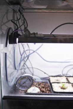 chciałem podzielić się z wami moim schronieniem dla rosiczek z grupy petiolaris. Zbiornik to terrarium o wymiarach 60x40x30. Oświetlany trzema żarówkami T5 24W, 2x Grolux i 1x Philips Master TL5 865, odbłyśniki połączone są ze sobą jak widać na zdjęciu blaszkami z OBI, a całość wisi na łańcuchach, również z wymienionego wcześniej marketu, dzięki ich użyciu w każdej chwili mogę łatwo zmieniać wysokość oświetlenia. Świetlówki pracują od 7 rano do 23, podczas ich pracy temperatura wewnątrz utrzymuje się na poziomie 32 C, kiedy gasną automatycznie włącza się wąż grzewczy, którego parametrów nie znam, ponieważ dostałem go, pozwala on utrzymać temperaturę nocą na poziomie 26 C, wąż przyklejony jest do ścianek terra za pomocą silikonu akwarystycznego. Dno zbiornika wyłożyłem agrowłókniną, przez co woda podsiąka pomału do doniczek i nie muszą stać bezpośrednio w wodzie. Rośliny w większości świeżo zakupione więc nie będę prezentował zdjęć poszczególnych egzemplarzy, zapewne przedstawię je za kilka miesięcy, gdy rośliny nabiorą kolorków i wyglądu. Wilgotność panująca wewnątrz podczas włączonego oświetlenia utrzymuje się na poziomie 60%, a nocą wzrasta do 70%, na razie, póki jest miejsce, do jej podniesienia używam pojemniczka z keramzytem zalanego do połowy wodą. Na dniach zamontuję wentylator komputerowy, oraz okleję terra jakąś matą odbijającą światło.