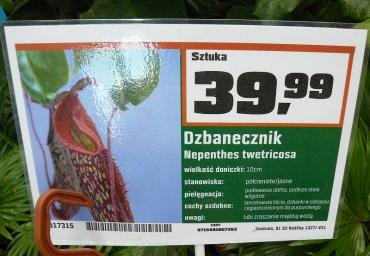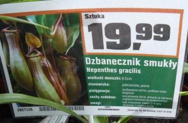 U mnie cena ciut inna. Roślina stojąca przy tabliczce wygląda tak. Dzbanek w zbliżeniu. Cała roślina. Czy możecie napisać co to może być? Po dzbankach jakoś nie pasuje mi na Nepenthes Gentle.