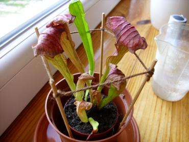 Nie wiem co się dzieje z tą sarracenią,po tygodniu jak zacząłem stopniowo ją wystawiać na słońce,prawie wszystkie kapturki na kielichach oklapły,jakby "chciały" chronić te charakterystyczne "usta" na brzegach kielicha. Roślina nie jest jeszcze wystawiana na pełne 12 godzinne słońce,bo coś słabo wypuszcza liście.Czy kapturnice szybko wypuszczają nowe liście (chociażby jak muchołówka) czy z nimi jest inaczej ? Poza tym na powierzchni torfu zauważyłem 2-3 białe robaczki,są całe białe i podobne trochę do mrówek . Proszę o radę