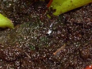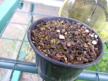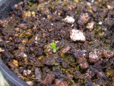 Kolej na mnie Wysiana rosiczka :spatulata giant czas wysiana: około miesiąca wstecz Z 3 doniczek tylko w jednej coś "wypukało",to młoda statulatka czy nieproszony gość ?
