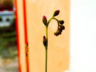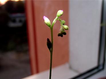 Hmm... Fotki poniżej, zrobione dzisiaj, przestawiają jeden z pędów kwiatowych. Pytania brzmią: - Czy ten pączek na samym dole jest już przekwinięty? Tzn. kwiatek już był ? - Czy zawiążą się nasionka, nawet, jak nie było przeprowadzanych żadnych zabiegów "wspomagających" samozapylenie (np. potrząsanie kwiatkiem) ?