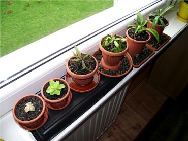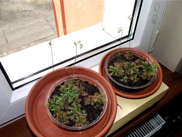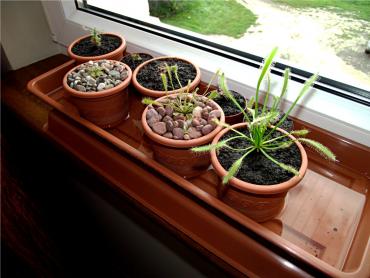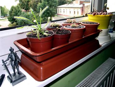 Porobiłem niedawno kilka fotek, więc wrzucam . Opanowałem już częściowo parapety w trzech pokojach (w czwartym zdobyty przyczółek) i część balkonu. Na ten rok już nie przewiduję powiększania hodowli - i tak lista gatunków jest dość długa (moja małżonka mówi, że o wiele za długa, hehehe). Generalnie wszystko rośnie i rozwija się dość dobrze. Oczywiście - są i problemy: dzbaneczniki nie dzbankują (Hokerek na razie nie potracił dzbanków i liczę, że utrzyma te, co ma przez jakiś czas), no i mam problemy z rosiczką madagaskarską. Mam dwie roślinki od dwóch różnych hodowców i u mnie po prostu nie chcą rosnać - zwyczajnie zamierają (nie wiedzieć czemu, bo rzekomo jest łatwa w hodowli). Fotki przedstawiaja widok ogólny na część hodowli i kilka wybranych, pojedynczych, roślinek.