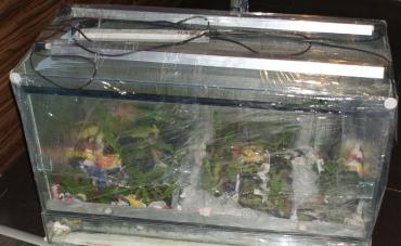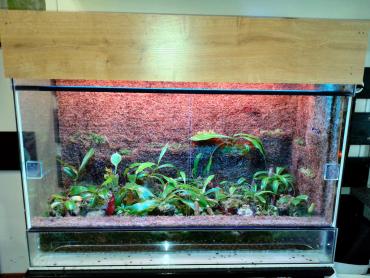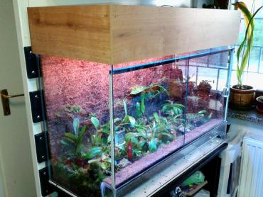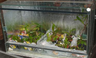 Pod koniec ubiegłego roku założyłem drugie terrarium, które stoi u mnie w firmie . Jego krótka historia: W grudniu zakupiłem okazyjnie używane terrarium o wymiarach 90x57x40 cm wraz z zestawem oświetlenia (T5 2x39W) i kilkunastoma roślinami. Same rośliny były w dobrym stanie, ale terrarium było w stanie wymagającym sporo pracy - ciekło, oklejone niestarannie folią i generalnie od razu widać było, że spełniało wyłącznie funkcję typowo hodowlaną, zaś dekoracyjność i estetyka (na co z kolei ja mam parcie ) była na poziomie bliskim zera. Więc, jak je kupiłem wygladało tak przed i po rozpakowaniu: A, że nie chciałem, aby dzbanki stały zbyt długo bez odpowednich warunków (umieściłem je w dużej kastrze budowlanej i przykryłem folią), Więc przeprowadziłem błyskawiczny mały remoncik, wyczyściłem, uszczelniłem i urządziłem po swojemu. Co ciekawe okazało się, ze poprzedni właściciel nie zdjął folii zabezpieczającej z wewnętrznej strony odbłyśników, która cała się stopiła, miejsami nawet zczerniała i diabelsko przywarła do stali - wiele trudu włozyłem, aby przywrócić im blask. Zrobiłem też pokrywę z paneli podłogowych dla ukrycia kabli, stateczników i rurek od nawilzacza (był w planie) i dwie ścianki z kieszeniami. Wpadłem na pomysł oklejenia ścianek włóknem kokosowym. Jak się póxniej okazało pomysł był średnio trafiony. W sumie prace zajęły mi około tygodnia (tylko wieczory), z czego dwa ostatnie dni to było właściwie tylko oczekiwanie na całkowite zakrzepnięcie silikonu. Fotki tylnej ścianki z kieszeniami przed oklejeniem kokosem: Fotki pustego terrarium przygotowanego do włożenia roślin: No i fotki terrarium zaraz po włożeniu roślin, jeszcze na szafce "roboczej" - stan na dzień 2013-12-24: Sorki za jakość fotek, ale wszystkie robiłem telefonem GSM. Początkowo świetlówki leżały na górnej szybie, obecnie od miesiąca są już wewnątrz terra. Rosliny się już zaaklimatyzowały zaczynają pompować pierwsze dzbanki. Strat w inwentarzu jak dotąd nie odnotowałem, więc nie jest źle . Skład gatunkowy, obserwacje i aktualne fotki dam za niedługo.