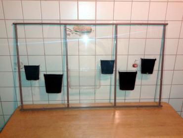 Ścianki zbudowane są z dość cienkiej pleksy (może z 1mm), lepsza byłaby grubsza, ale tylko taką miałem pod ręką - z uszkodzonej dużej antyramy do zdjęć. Jako, że były zbyt giętkie, do ich usztywnienia i wzmocnienia konstrukcji użyłem plastikowych, pustych w środku, sztywnych listewek, które są do kupienia w składach budowlanych jako listwy do klinkieru (jakoś 2,50 zł za 2m). W pierszym terrararium mocowałem je za pomocą kleju, ale w tym do montażu użyłem nierdzewnych, krótkich wkrętów o dużych, płaskich łbach (szybciej idzie praca i pewniej trzymają). Przy okazji zrobię zdjęcie takiej ścianki od tyłu i umieszczę w tym temacie. Nastepnie z nieuzywanych kwadratowych doniczek produkcyjnych oraz z plastkowych pudełek po lodach powycinałem nożykiem do tapet takie "kieszenie", które przykleiłem do pleksy uniwersalnym, wodoodpornym klejem polimerowym. Przedtem całą powierzchnię pleksy zmatowiłem papierem ściernym. Jak to wyglądało po przyklejeniu (jeszcze bez kokosa) jest uwidocznione kilka postów wyżej. Matę kokosową przyklejałem w szerokich pasach tym samym klejem. Mam jedna fotkę, jak wygladała ścianka pokryta klejem przed położeniem maty: Po położeniu maty została ona starannie dociśnięta do pleksy, następnie poustawiałem na niej obciążenie (napełnione wodą słoje i butelki) i pozostawiłem na 24h do całkowitego wyschnięcia kleju. Kleju na dwie ścianki zużyłem równe 500ml. Ścianki stoją oparte o dno terrarium, o tylną i boczną szybę oraz o siebie nawzajem (w rogu), całość jest stabilna i nie grozi zawaleniem nawet pod dość dużym ciężarem. No i tyle, jesli chodzi o moje ścianki .