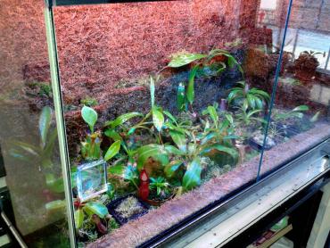 Dzięki za miłe słowa Terrarium ma już ponad rok, więc pora na krótkie wnioski i obserwacje. Generalnie w tym terra borykam się z problemem zbyt wysokiej temperatury, która jest na poziomie (w dzień) 30-33 stopnie C, a w lato dochodzi nawet do 35. Świetlówki świecą od 7.00 rano do 22-23.00 wieczorem. Będę je musiał już powoli wymienić, bo chyba są zużyte (chociaż roślinom to chyba nie przeszkadza). Wilgoć utrzymuje się na poziomie w dzień około 45-50%, w nocy 70-80%, mierzone na poziomie +/- połowa wysokości terra (na fotkach widać czujnik). Nadmieniam, że nie wykonuję żadnych zabiegów poza ręcznym zraszaniem deszczówką roślin i tła 1-2 x w tygodniu. Co do roślin: Świetnie rośnie N. spectabilis x ventricosa, N. fusca, D. adelae, Cephalotus, D. prolifera (weszła mi w stan spoczynku), Heliamphora minor i pływacze (U. longifolia i U. warburgii). N. vogelli, N. gymnaphora, N. ramispina i N. aristolochioides x mira mają się dobrze, wypuszczają nowe liście, ale albo pompują małe dzbanki, albo wcale. Odkąd mam to terra padły mi N. muluensis x lowii, N. vieillardii i N. hookeriana (akurat on to sam nie wiem dlaczego), D. prolifera. N. venticosa zaczął mi obumierać, więc trafił z powrotem na parapet i ma się dobrze (nadmieniam, ze był w kieszeni tła dość wysoko nad dnem terra). Ponadto doszły N. ampullaria i jedna krzyżówka (zapomniałem nazwy), które już się ukorzeniły i zaczynają rosnąć. No i mech - ten rośnie dobrze i na dnie terrarium, i w doniczkach (tam, gdzie jest podłożem) i w kieszeniach w ścian (tła).
