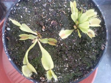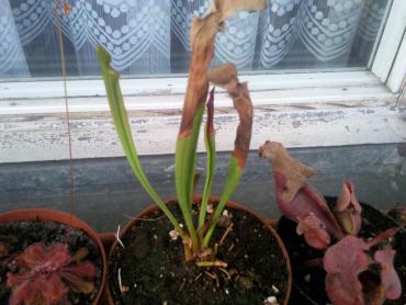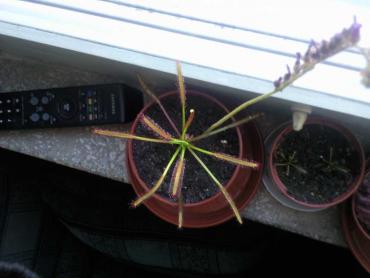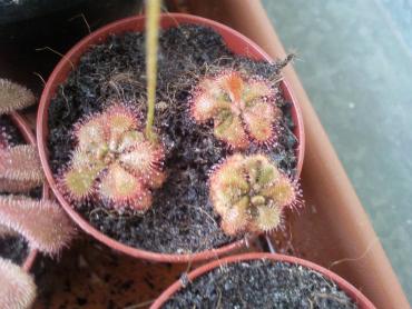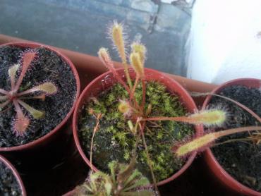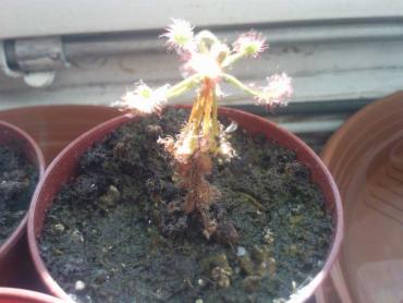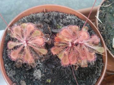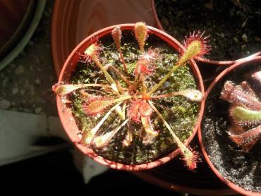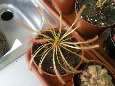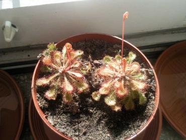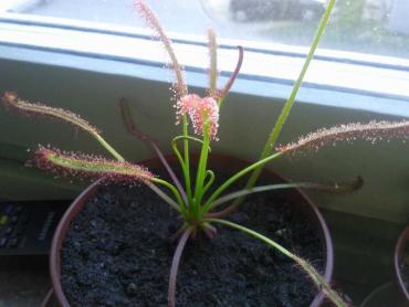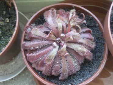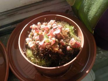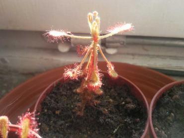 Witam. Jedna z nich od dłuższego czasu nie wytwarza rosy i usycha, dwie pozostałe od kilku dni nie wytwarzają rosy i też zaczynają usychać. Kilka dni temu wszystkie rośliny oprócz zimujących przeniosłem z balkonu na wewnętrzny parapet południowy. Inne rośliny rosną dobrze nie straciły rosy tylko z tymi rosiczkami mam problem. Systematycznie marnieją. Nie zauważyłem żadnych szkodników oraz pleśni. Stanowisko:południowy parapet, podlewana wodą destylowaną, woda prawie cały czas w podstawku daje jeden dzień na przeschnięcie, nie doświetlane. Jakieś sugestie co może być przyczyną ? Zdjęcie pierwszej rośliny w najgorszym stanie. Druga roślina w trochę lepszym stanie. Trzecia roślina w najlepszym stanie.
