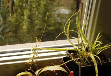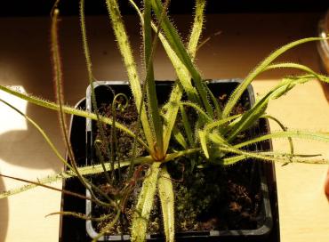 Dziękuję za miłe komentarze Obovatka już wygląda przyzwoicie, czego nie można powiedzieć o rotundifolii i coccicaulis clon 2. Rozetkowe rosiczki beznadziejnie zniosły (no, właściwie nie zniosły) kwitnienie podczas upałów. Stan D. filiformis i filiformis x intermedia przez ten czas wcale się nie pogorszył, już produkują nasionka. Obovatka wśród mucholców: Doniczka pigmejkowa v.2, z nowymi pigmejkami Niektóre były źle podpisane, ale chyba już udało mi się je rozpoznać: 1. D. pygmaea (podpisana jako pygmaea i sargentii) 2. D. microscapa 3. D. helodes 4. D. manni B +microscapa? (ta druga jeszcze nie przypomina osobnych rosiczek tylko zieloną bryłę) 5. D. oreopodion 6. I tu nie wiem, bo teoretycznie powinnam jeszcze dostać sargentii, podpisana była jako callistos, a bardziej przypomina helodes lub dużą oreopodion. Ktoś coś? 7. D. callistos (podpisana jako helodes) Poza tym niezmiernie mnie raduje, że sporo rosiczek kwitnie: D. binata var. multifida f. extrema (foto jak na razie brak), D. communis (lub spatulata), D. sp. South Africa (poprzedni pęd niechcący przypaliłam lampą), D. madagascariensis D. filiformis "red" (obok regia oraz Moja Wspaniała Regia z 7 stożkami wzrostu) W doniczce capensisowej też widziałam jakiś pęd, ale już się ukrył wśród gąszczu świeżych liści. Ten kłębek to tylko 1 albino i 1 typical, każda z kilkoma-kilkunastoma stożkami wzrostu. Oczywiście P. moctezumae również wypuścił kwiatka, także nastawiam się na kolejny zbiór nasion Żeby tak jeszcze regia zakiwtła...