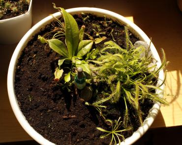 Apdejt: Pigmejkowa doniczka ładnie zarosła. Doszedł P. sp. El Mirador. Miałam dodać do niej więcej miniaturowych tłustoszy, ale transakcja nie doszła do skutku. Może kiedyś wypełnię te luki między poszczególnymi gatunkami, jak znajdę jakąś korzystną ofertę... Dzbaneczniki, ze względu na łączącą je chorowitość, trafiły do jednej doniczki. Stoją sobie w terrarium i problem przędziorków chyba jest już zażegnany Miałam zamiar pozbyć się wszystkich muchołówek, ale tych 20 niedobitków nikt nie chciał Również trafiły do jednej niewielkiej doniczki. Raczej na balkonie nie mam odpowiednich warunków na zimowanie, więc tę zimę spędzą pod żarówką przy lekko obniżonej temperaturze. A teraz nieowadożerne - fiołki afrykańskie: Rob's Flim Flam i Rob's Squeeze Toy - semiminiatury rosnące w doniczkach 5,5cm Willodene LE-Młoda Wiosna