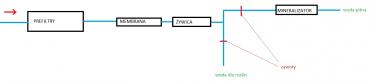 Korpus z żywicą jonowymienną ma za zadanie zebrać te jony, których nie wyłapała membrana, z tego powodu powinien być podłączany tuż po membranie. Mineralizator powinien być podłączony na samym końcu, ale będzie to równoznaczne z produkcją wody niezdatnej do podlewania roślin. Dlatego jeśli potrzebujesz wody do podlewania roślin będziesz musiał odłączyć mineralizator i zbierać wodę za żywicą. Ja bym spróbował rozwiązać to tak jak na dołączonym obrazku: Czerwoną strzałką zaznaczyłem kierunek przepływu wody. Nie wiem czy tak powinno się robić, ale po etapie żywicy możesz zainstalować trójnik i 2 zawory. W zależności od potrzeb, np. w celu zebrania wody dla roślin, możesz zakręcać zawór wody pitnej (spożywczej) i w tym czasie odkręcać zawór od wody do roślin lub na odwrót w przypadku wody do picia. Pewnie rolę zaworu do wody pitnej może pełnić zwykły kran, chociaż obawiałbym się trochę o cofanie wody z mineralizatora do wody dla roślin. Nie potrafię pomóc w sprawie komponentów do celów spożywczych. Myślę, że nawet taki za 3x mniejszą cenę z ebaya, zamówiony z Chin Ci wystarczy. Oczywiście taki wskaźnik może służyć za wyznacznik potrzeby wymiany prefiltrów lub membrany. Prefiltry powinno się wymieniać niby co pół roku, jednakże doświadczenia kuby989898 wskazują, że można z ich korzystać nawet dłużej. Trudno określić jakie wartości za membraną są dopuszczalne. Nowy filtr RO dawał w moim przypadku wodę o czystości między 10-20 ppm (już nawet nie pamiętam), po ponad roku użytkowania parametry wody ustabilizowały się na około 13 ppm i tak jest do dzisiaj.