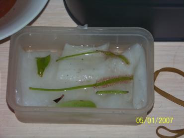 Witam tak jak w temacie. Wyrosła mi mała D.capensis z kawałka korzenia, może zacznę od początku... Miałem zamiar rozmnażać Capensisa z liścia,korzenia i pędu kwiatowego. Wsadziłem te rzeczy do pojemnika, na dole był ręcznik papierowy zalany wodą demineralizowaną. Po 1tyg liście zwiędły tak jak pęd, myślałem że korzeń też jest do niczego... Dziś patrze a tu malutka zielona kuleczka Ale... Co dalej mam zrobić. Położyć ją na torf czy zostawić ją w wodzie , na razie zabrałem ją do pojemnika zrobiłem tak że, zielona roślinka jest na górze a reszta korzenia za moczona w wodzie. Proszę o Pomoc!!! POZDRAWIAM