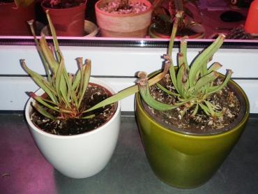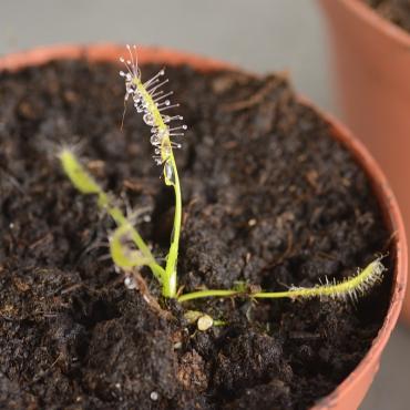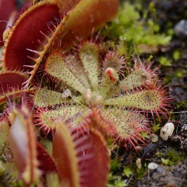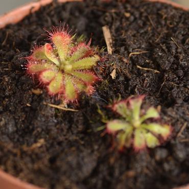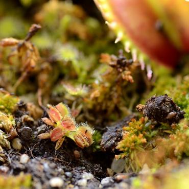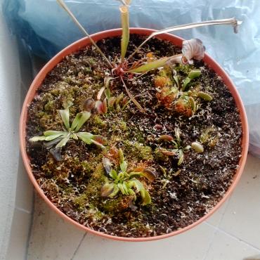 Zimowanie zamierzam przeprowadzić na balkonie - donica zostanie okryta worem słomy i przykryta gałęziami świerku w przypadku braku śniegu i dużych mrozów. Czy rotundifolie przeżyją - szczerze powiedziawszy nie mam pojęcia. Największa siewka ma około centymetra średnicy, młodsze - są maleńkie, maksymalnie półcentymetrowe i częściowo ukryte w torfowcu. Cóż, można powiedzieć - lajf iz brutal and full of zasadzkas. Jeżeli nie przeżyją - trudno, jak dadzą radę - fajnie Jedyne dwie rośliny, które chcę ewakuować przed zimą, to dwóch gości na gapę - D. capensis 'albino' i druga rosiczka, na razie niezidentyfikowana, ale ponad wszelką wątpliwość nie rodzima.