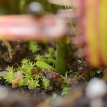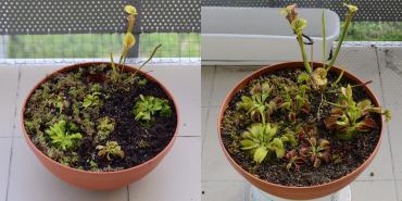 Sierpniowa aktualizacja stanu misy. Mimo obaw wszystkie rośliny przeżyły wakacje - nawet siewki! W misie zaczęło robić się dość tłoczno, choć przy sadzeniu niespełna trzy miesiące temu zadbałam, by roślinki mały wokół siebie dużo miejsca, a przecież te największe wydawały się już tak dorodne, że przecież nie mogą być już dużo większe, prawda...? Cóż, błąd Zdjęcie po lewej - 31 maja, zdjęcie po prawej - 14 sierpnia. Muchołówki z Obi przestały już wyglądać jak rozdeptane pająki, powiedziałabym wręcz, że prezentują się całkiem dorodnie Przypomnę, że tak wyglądały jeszcze dwa miesiące temu: Zaś siewki radzą sobie raz gorzej... ...raz lepiej. Ze wskazaniem, na szczęście, na to drugie. Poza tym znalazłam kilka kolejnych siewek rosiczek okrągłolistnych, zaś zasadzone pędy kwiatowe, choć uschły u góry, trzymają się twardo i coraz bardziej nastawiam się, że już wkrótce z torfu wyjrzą młode roślinki.