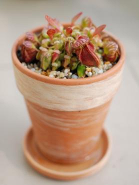 Podjęłam męską decyzję i przesadziłam cefalotusa. Dostał bardzo lekką mieszankę piasku z torfem, z maleńką domieszką perlitu i dość drobnego żwirku (na dół doniczki). Torf w którym rósł był mocno zbity, wypłukałam go najdelikatniej, jak mogłam. Mam nadzieję że roślinka przeżyje, choć oczywiście liczę się ze stratami. Jak widać koledze było już konkretnie ciasno, aż postanowił ewakuować się dołem Po przesadzeniu roślinka wygląda tak: Własne doniczki dostały też wcześniej rosnące z muchołówkami rosiczki tropikalne: Na deser - "sierotka" z Obi za 7 zł, wyjątkowo dobrze zareagowała na zmianę podłoża i warunków, przyrumieniła się i wypuściła kilka pseudo-kapturków.