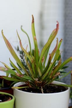 Miałam dziś dzień dobroci dla roślin. Po pierwsze, zebrałam się w końcu w sobie i pojechałam po polysect, by wyeksterminować tarczniki, które zalęgły mi się na flavie. Przy okazji spryskałam absolutnie wszystkie rośliny balkonowe, na których zauważyłam mszyce, a reszta dostała chemią z rozpędu, gdybym jednak coś przeoczyła. Tutaj tarcznik widoczny jest przy nerwie, obok suchego miejsca: Przy okazji zakupów ku swojej radości (a przerażeniu lubego) zauważyłam półkę z przecenami, na której stały dwie doniczki z katurnicami. Oczywiście nie mogłam się powstrzymać przed uratowaniem jednej z nich Nie mam pojęcia, co to za gatunek/mieszaniec, gdyż wszystkie kaptury były uschnięte, a reszta to zielone jak szczypiorek phyllodia. Osobiście stawiam na alatę albo coś podobnego. Tak wygląda po intensywnym płukaniu torfu i przesadzeniu: Cefalotus przeszedł gruntowne "prześwietlanie" - wyskubałam z kępki ze 20 uschniętych młodocianych dzbanuszków, które nagromadziły się przez te kilka miesięcy, od kiedy go mam. Kępka wygląda teraz o wiele estetyczniej, powietrze i światło mają dostęp do jej środka, zmniejszyło się więc ryzyko rozwoju pleśni, a nowe dzbanki mają wolną drogę na świat (zauważyłam dużą liczbę ich zawiązków). Roślinka straciła mocno intensywny kolor, jak domyślam się powodem są wysokie temperatury, a jak czytałam cefale najpiękniej wybarwiają się na chłodzie.