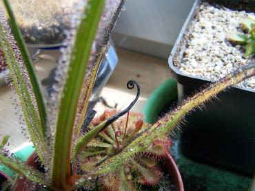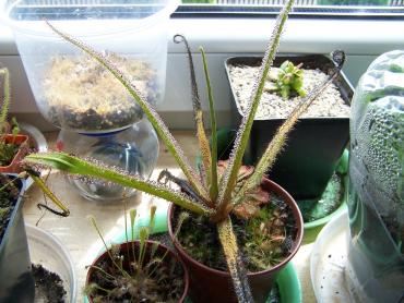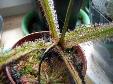 Witam, Od czasu kiedy zaczęły się upały mojej rosiczce zaczęły błyskawicznie czernieć liście od końca, sczerniał też nierozwinięty liść, od środka. Rosiczka spowolniła swój wzrost, a zdrowe liście sczerniały na krawędzi od strony okna. Uważam, że może to być wina zbyt wysokiej temperatury, suchego powietrza lub zbyt mocnego słońca. Macie jakieś pomysły co to może być i jak temu zaradzić? Ja myślałem żeby ją przesadzić do wyższej doniczki (mieszanka: torf, perlit, piasek) i postawić trochę dalej od okna, rosiczka obecnie stoi na wschodnim parapecie i czasami jest doświetlana świetlówkami 2x 39w (nie zawsze po ok 2 godziny).