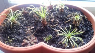 Szkoda mi tych najmniejszych rosiczek...Kilka z nich w innej doniczce już kompletnie wyschły. Dlatego się zdziwiłem,bo nie pierwszy raz przesadzam rośliny owadożerne a kilka odmian już przerabiałem. Parę sztuk nawet się rozmnożyło w tym starym podłożu. Teraz wszystko ,,zdycha''
