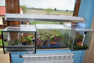 Wielkie dzięki za miłe słowa spijając_nektar. Zdjęcie całości jest raczej niemożliwe jako, że część roślin znajduję się na parapecie w pokoju obok a także na zewnątrz, ale to widok na mój parapet: 2 zbiorniki to stare, zaniedbane akwaria, ale udało mi się jest uszczelnić i sprawić, że znów są zdolne do użytku. Z kolei terrarium po lewej udało mi się zdobyć w cenie 30 zł na allegro
